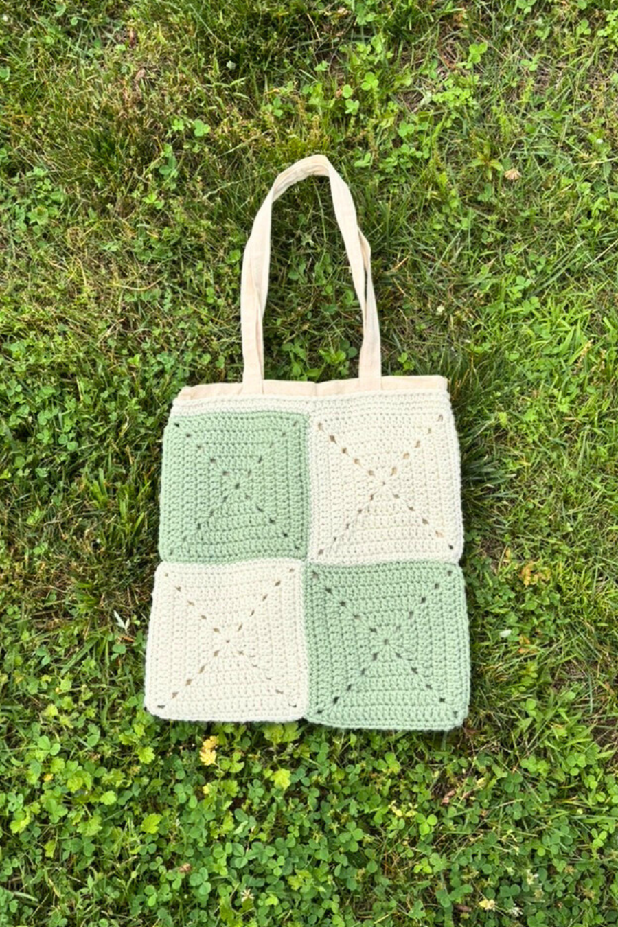 Our one of-a kind crochet tote bag features a beautiful green and cream checkerboard pattern. Handmade with soft acrylic yarn and lined with sturdy canvas for extra durability and structure